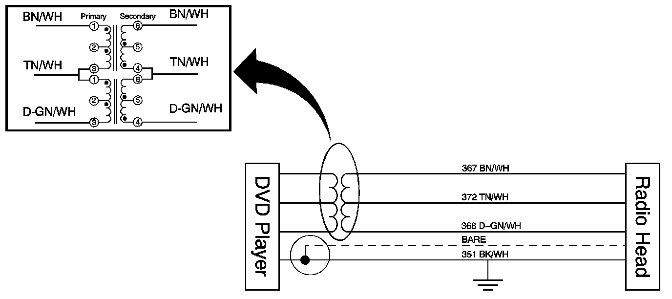 To greatly reduce the noise, install two audio transformers (filters) into the DVD player remote playback device audio signal circuits and connect drain wire to DVD player ground using the procedure listed below.