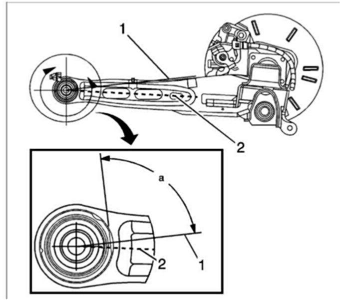 1. Align the flat edge of the bushing to be 90 degrees to the fluid axis (1). The fluid axis is 9 degrees from the center line of the control arm.