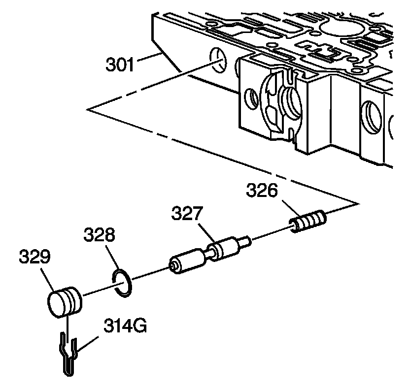 15. Remove the TCC regulator apply valve bore plug (329), O-ring seal (328), TCC regulator apply valve (327) and TCC regulator apply valve spring (326) from the control valve body (301).