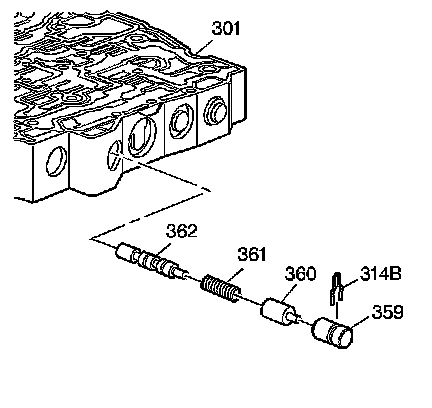 20. Remove the 4-3 manual downshift valve bore plug (359), 4-3 manual downshift valve (360), 4-3 manual downshift valve spring (361) and 3-4 shift valve (362) from the control valve body (301).