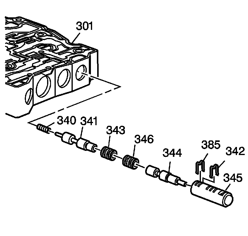 26. Remove the 2-3 accumulator valve bushing assembly (345), 3-4 accumulator valve (341) and 3-4 accumulator valve spring (340) from the control valve body (301).