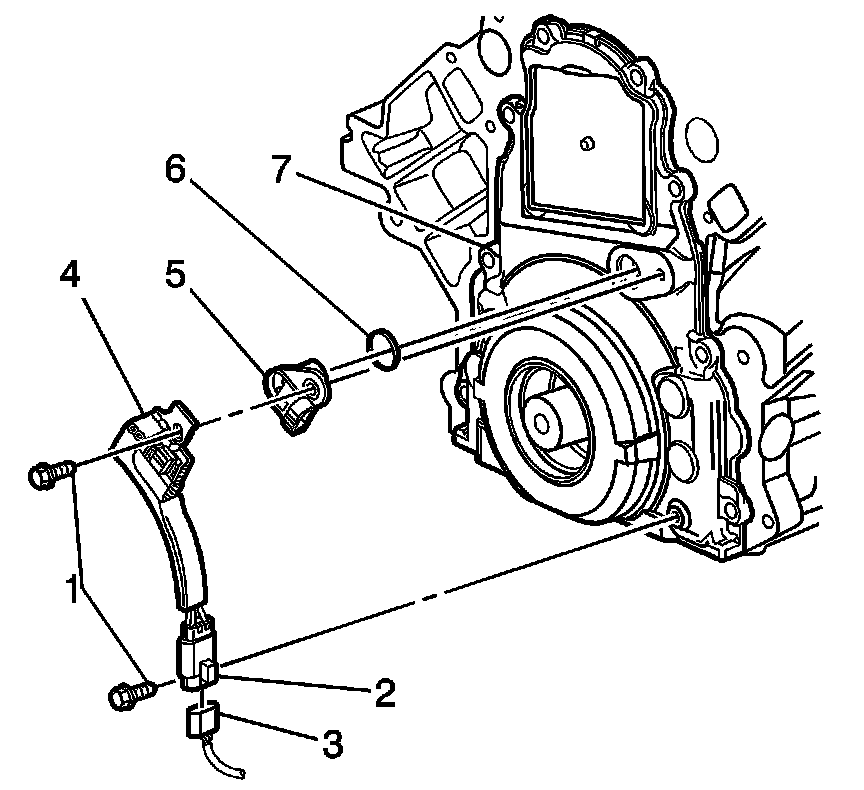 3. Remove the camshaft position sensor assembly (4, 5, 6) from the front cover (7).