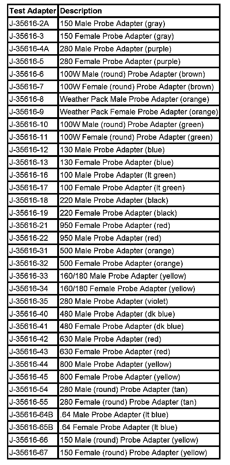 Notice: Do not insert test equipment probes (DVOM etc.) into any connector or fuse block terminal. The diameter of the test probes will deform most terminals. A deformed terminal will cause a poor connection, which will result in a system failure. Always use the J-35616 GM-Approved Terminal Test Kit in order to front probe terminals. Do not use paper clips or other substitutes to probe terminals.