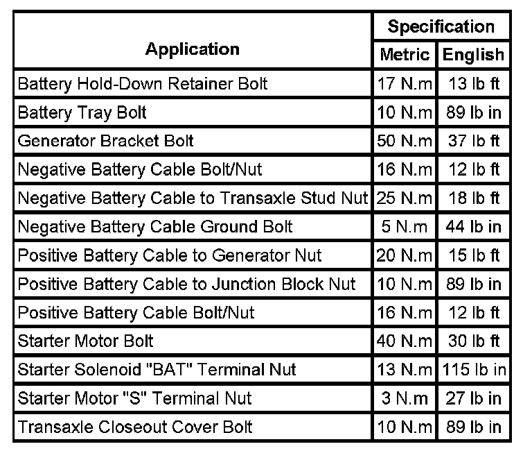 Starting and Charging: Specifications
