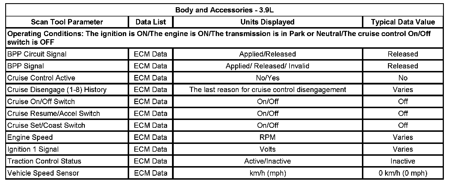 The scan tool data lists contain all of the cruise control related parameters that are available on the scan tool. The parameters in the list are arranged in alphabetical order. The data list column indicates the location of the parameter within the scan tool menu selections.