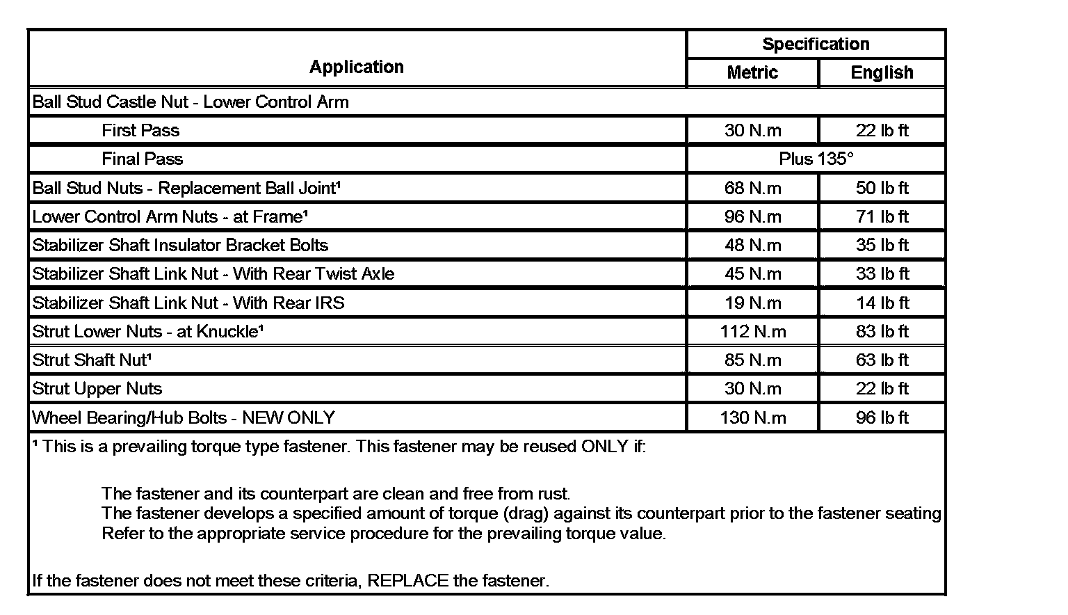 Fastener Tightening Specifications: