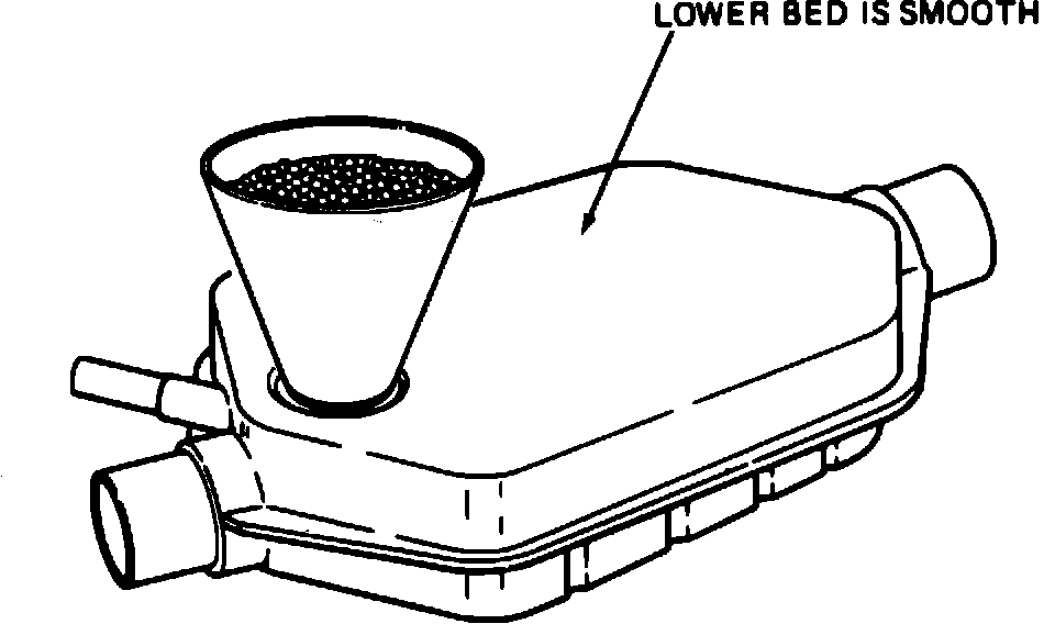 9. Using funnel J-34155-3, pour the sifted beads into the lower bed of the new converter. (see Figure 2.) Tap belt flange with rubber mallet to allow beads to settle. Continue filling and tapping until converter is full. If additional beads are required to completely fill the lower bed, it will be necessary to obtain a lower bed bead kit from the parts department. Excess beads from the kit should be saved in a clean container for future use.