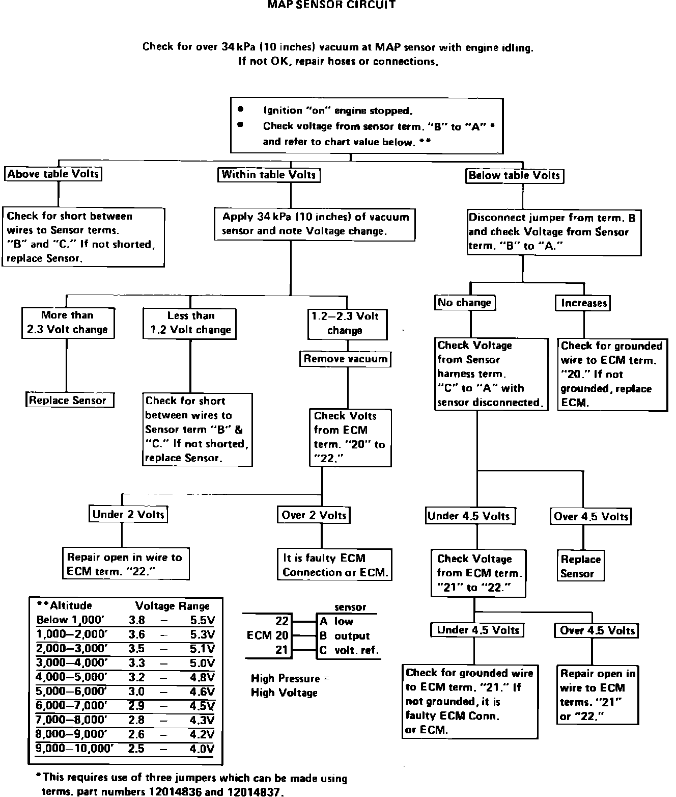Fig. 8 MAP sensor diagnostic chart. All models with MAP sensor exc. carbureted V6-231/3.8L w/turbocharger (use this chart with EST diagnostic & performance charts):