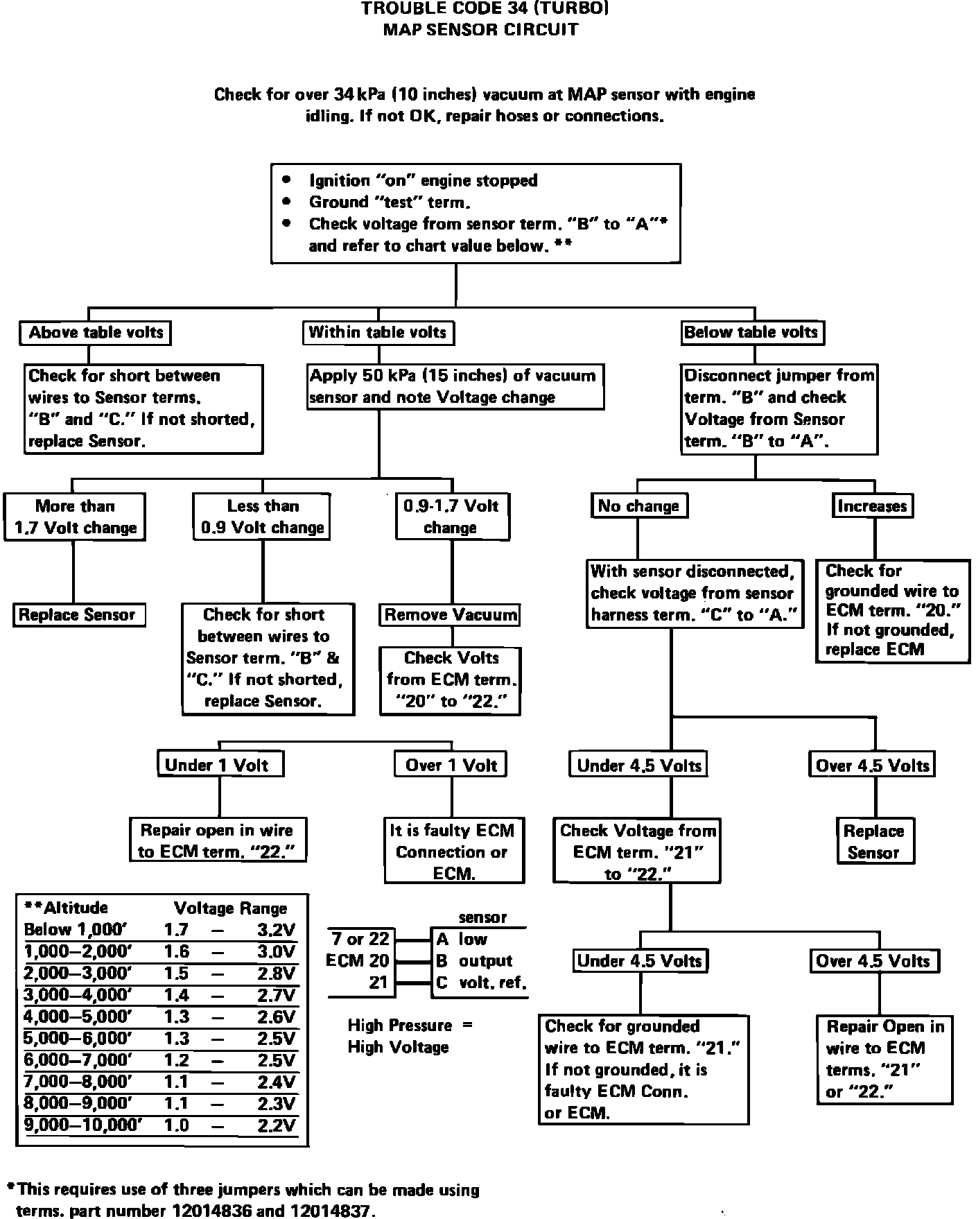 Fig. 9 MAP sensor diagnostic chart. Carbureted V6-231/3.8L w/turbocharger (use this chart with EST diagnostic & performance charts):