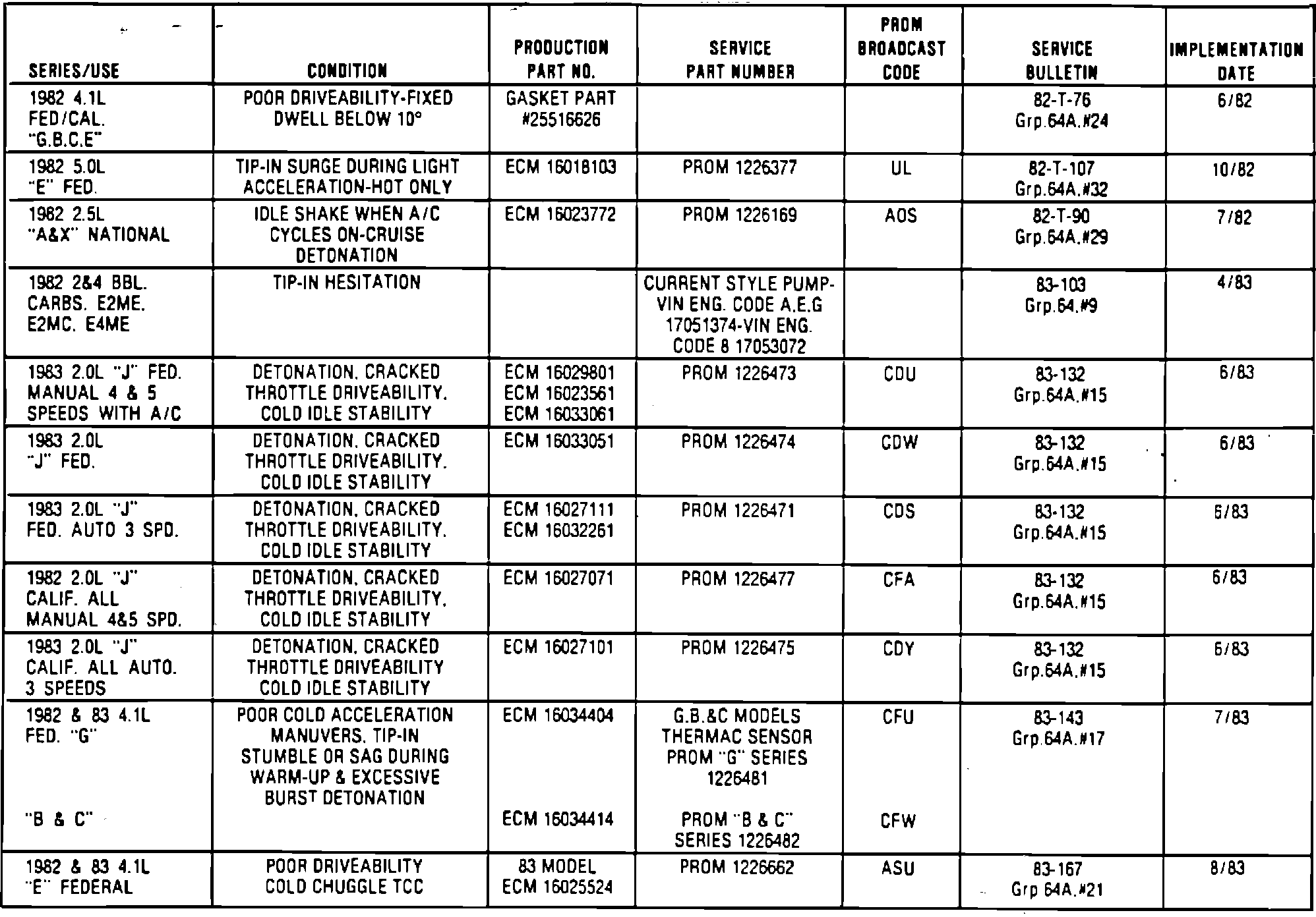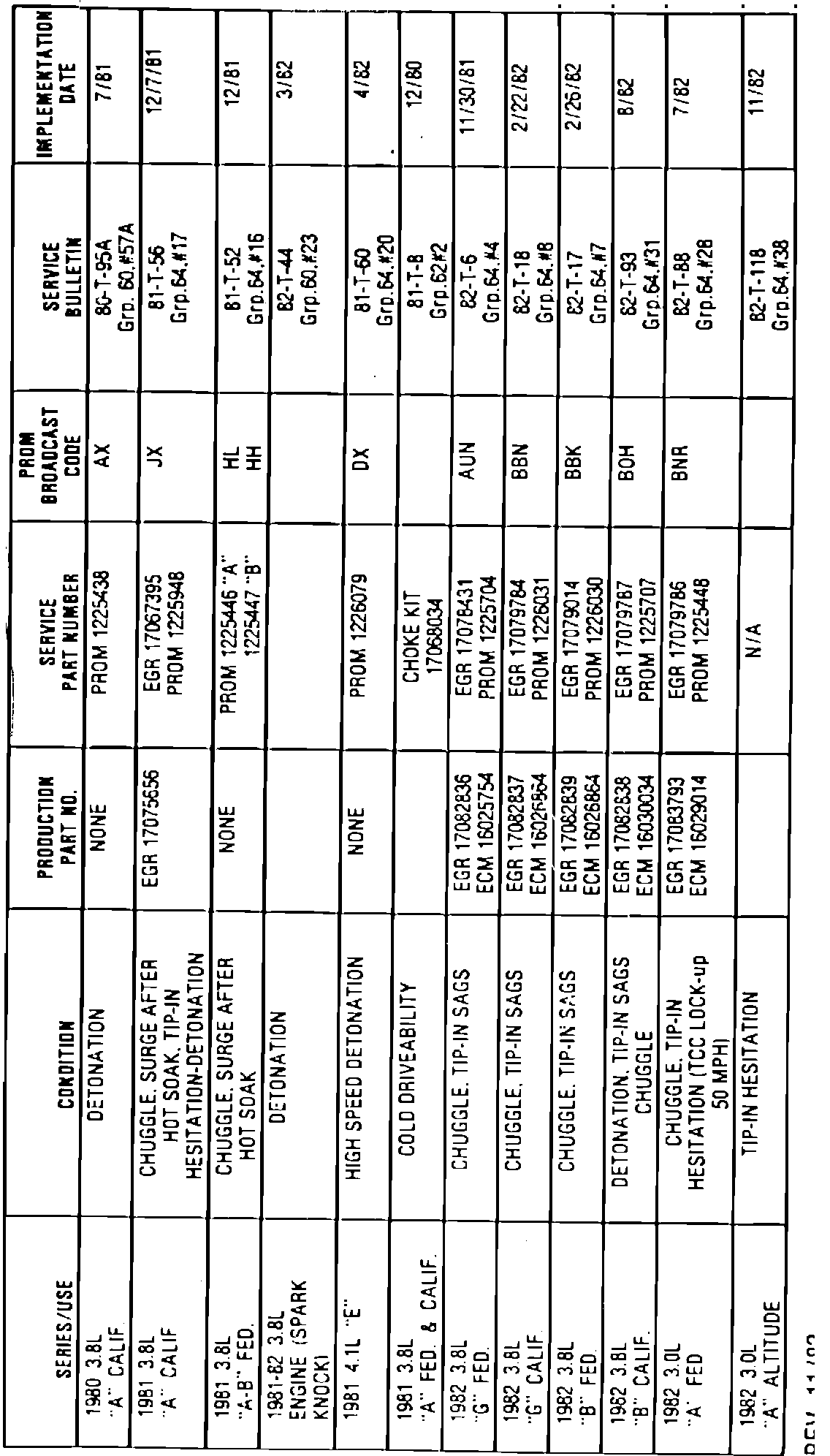 On the inside of this Bulletin is a quick and handy reference chart for Buick's current replacement PROMS and/or EGR to fix owner's driveability comments.