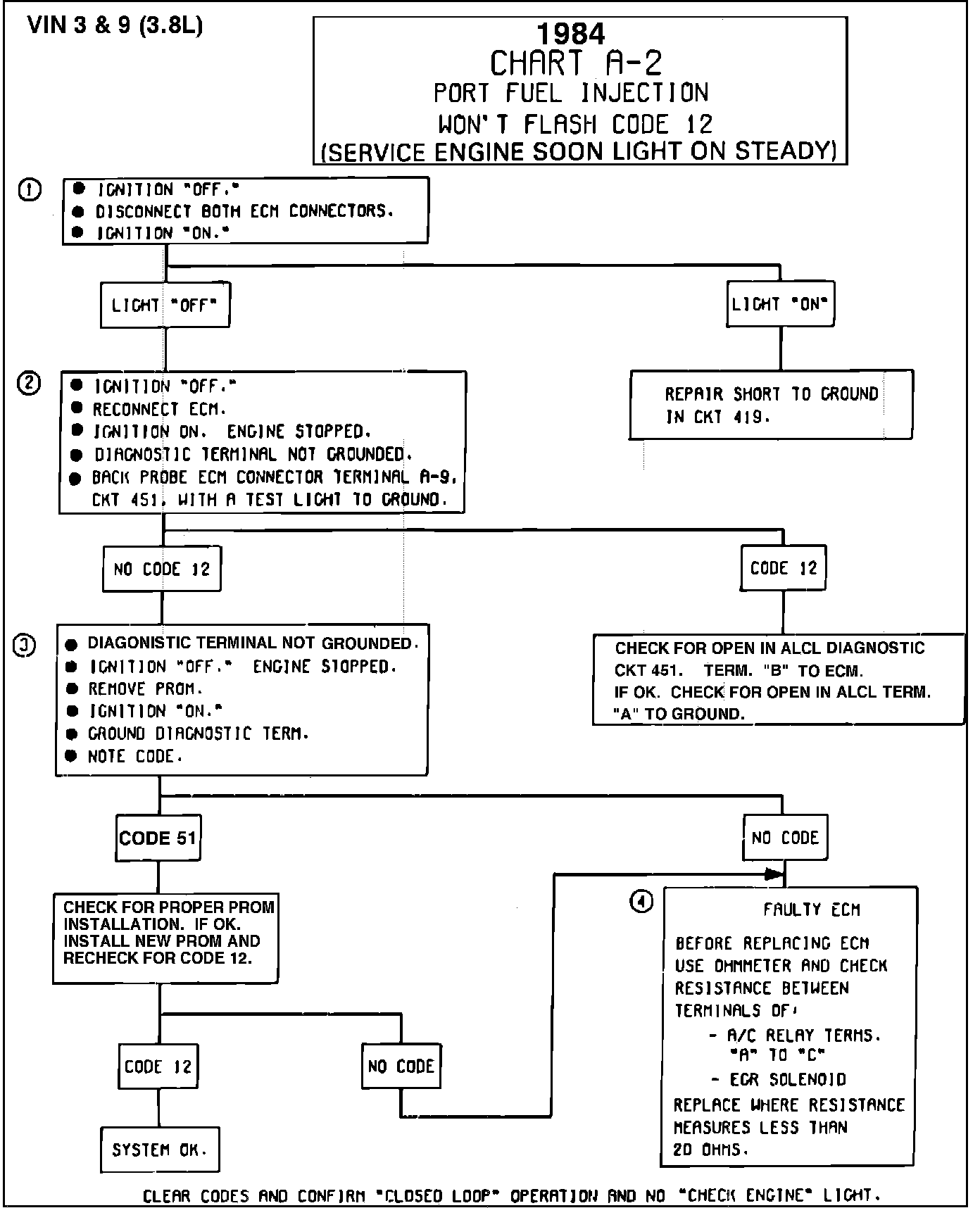 CHART A-2, WON'T FLASH CODE 12 ("SERVICE ENGINE SOON" LIGHT ON STEADY)