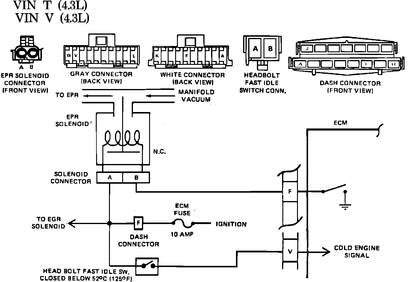 The EPR solenoid controls vacuum to the EPR valve. The EPR solenoid, when energized, allows engine pump vacuum to close the EPR valve. The same vacuum source is used for both EGR and EPR solenoids. 12 volts is supplied from the ignition, and the ECM completes the ground to energize the solenoid. The ECM will not recognize an electrical fault in the EPR circuit, but will detect a vacuum leak causing no EPR. The EPR is turned "OFF" by the ECM when engine temperature is below 52°C (125°F). The engine temperature switch, when closed, signals the ECM that the engine is cold.