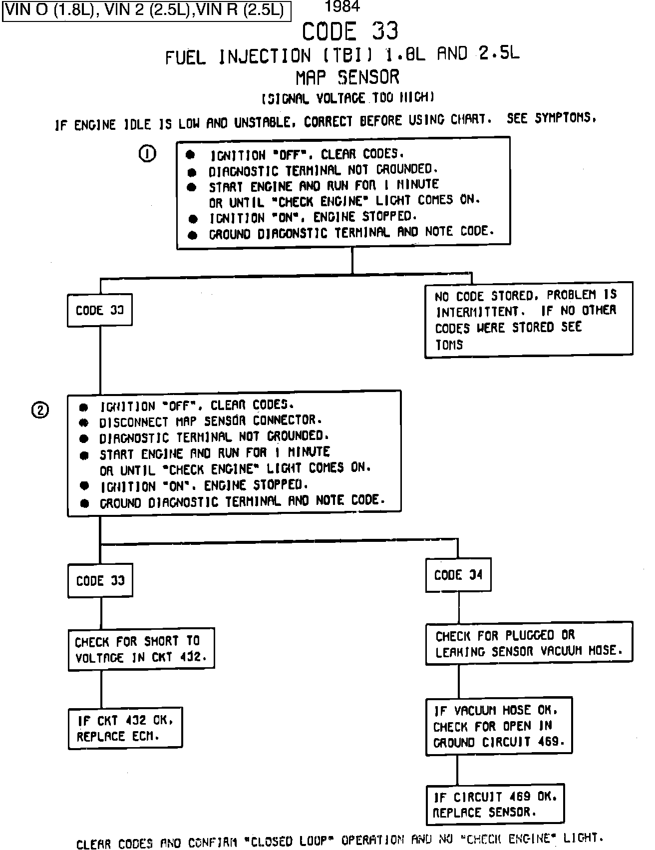 Engine misfire or a low and unstable idle may set Code 33. Disconnect MAP sensor and system will go into backup mode. If the misfire or idle condition remains, see Symptoms