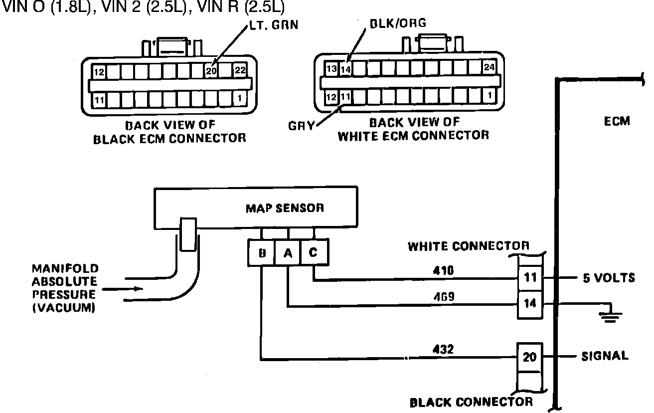 The Manifold Absolute Pressure sensor (MAP) responds to changes in manifold pressure (vacuum). The ECM receives this information as a signal voltage that will vary from about 1 to 1-1/2 volts at idle to 4-5 volts at wide open throttle.