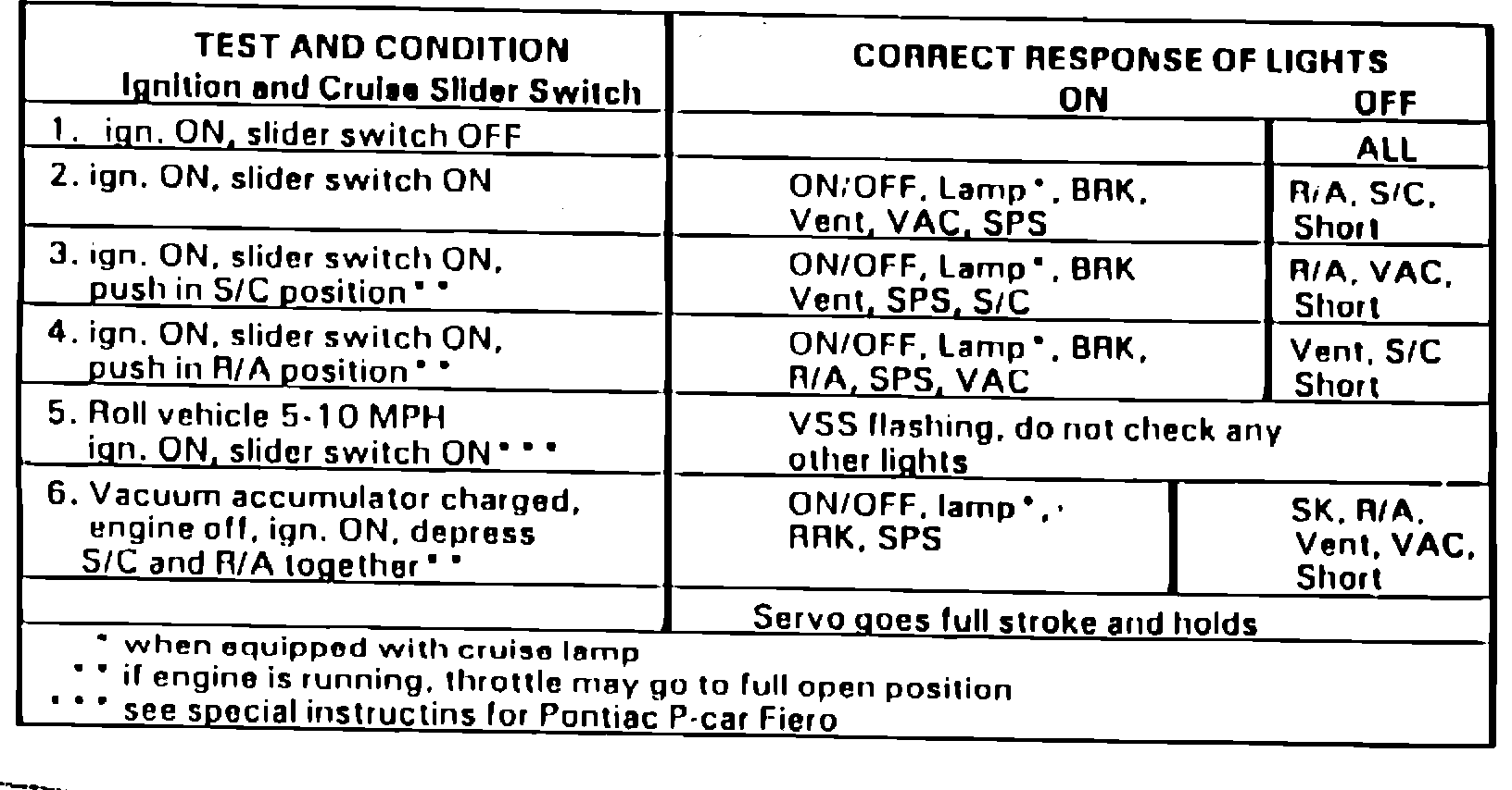 The existing diagnostic test procedure (see figure 1) listed on the reverse side of these "Quick Checkers" includes five troubleshooting steps.. Each step provides a reliable indication--by the illumination of a light--of the electrical continuity of specific components in the cruise control system. A large number of GM Dealership service personnel are under the misunderstanding that these same five steps, also, verify the condition of the cruise vacuum system. This is not the case. To clear up this mistaken assumption, an essential addition has been incorporated in the existing test procedure: