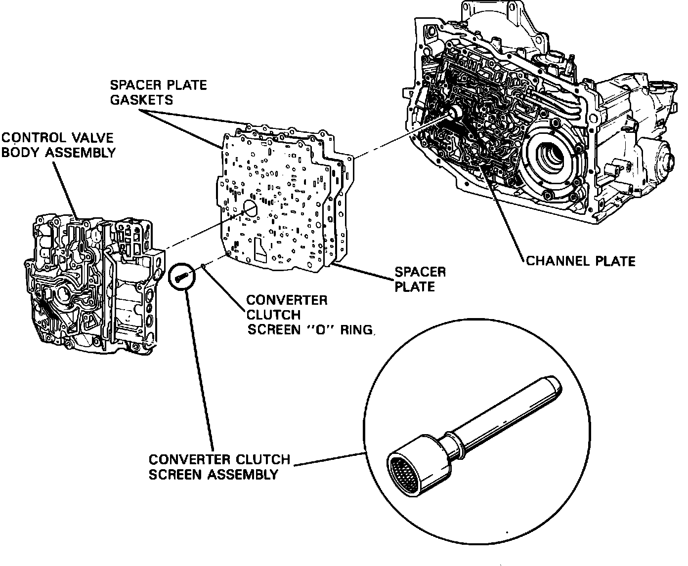 When the valve body is removed from a THM 440-T4 for any reason, make sure the TCC solenoid screen and/or O-Ring is not missing or mispositioned. Sometimes the screen may be mispositioned due to wear or breakage of the plastic tabs that hold the screen in the spacer plate. If the screen or seal is missing, worn or damaged, replace with the service part listed below.