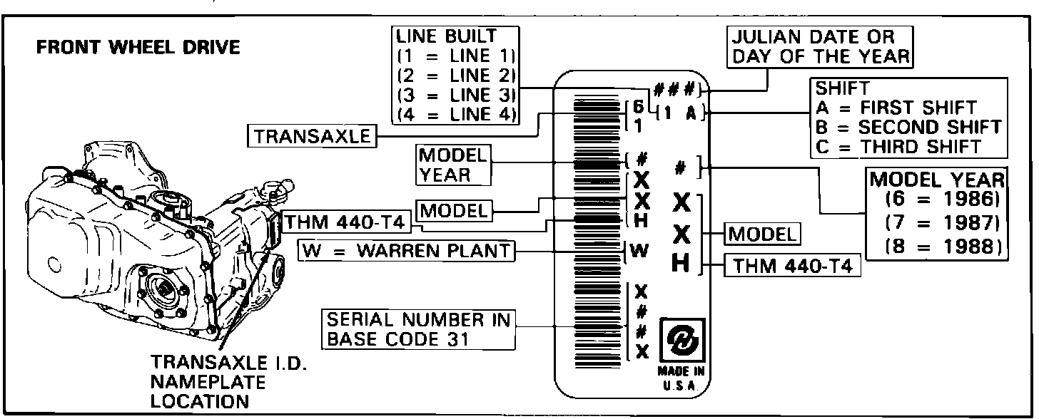 FIGURE 2 - THM 440-T4 TRANSAXLE IDENTIFICATION INFORMATION:
