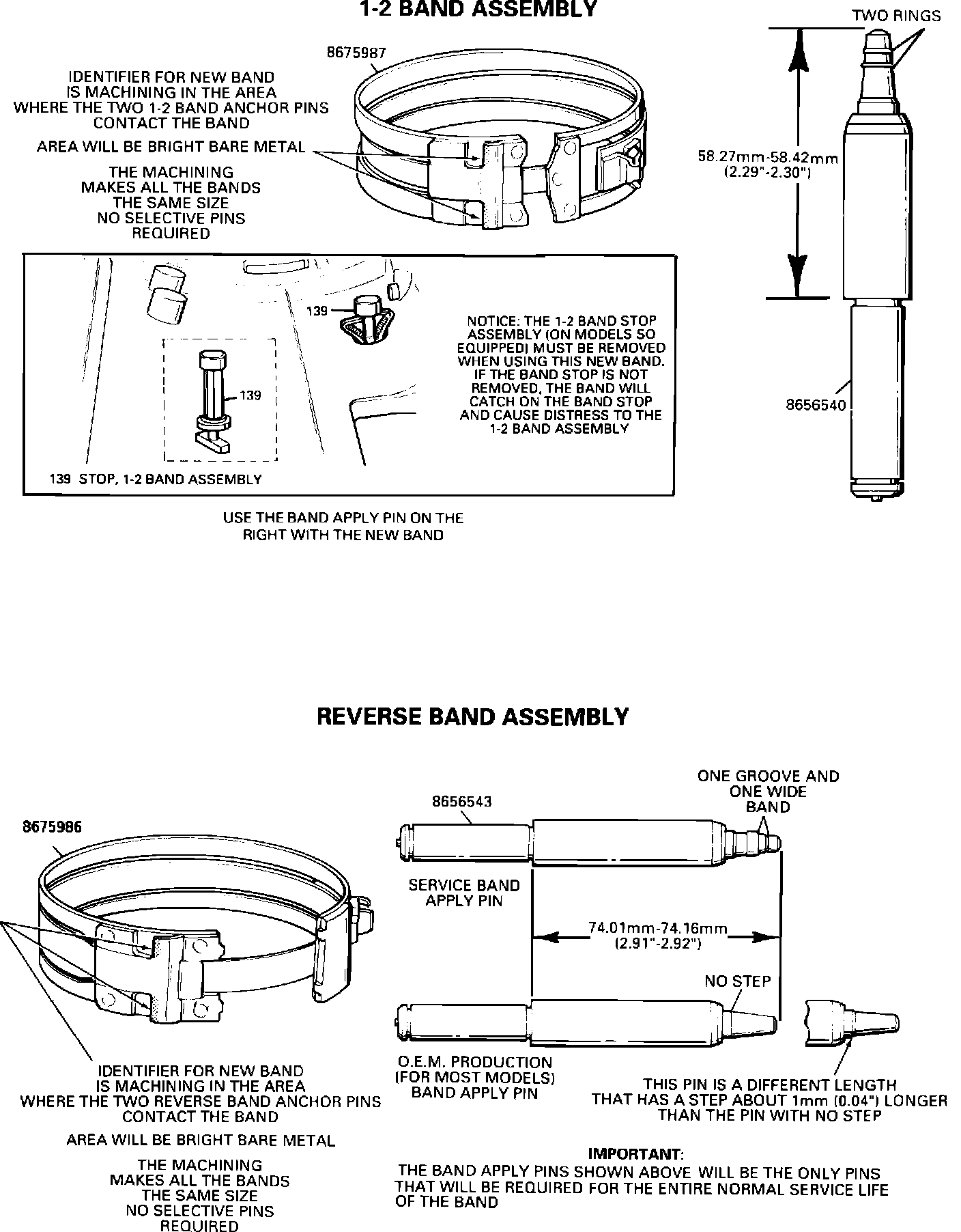 The new 1-2 and reverse band assemblies do not require selective band apply pins. A new manufacturing process machines the area where the case anchor pins contact the band. With this new process, all the 1-2 bands are the same size and all the reverse bands are the same size. With the bands all the same size, selective band apply pins are not required.
