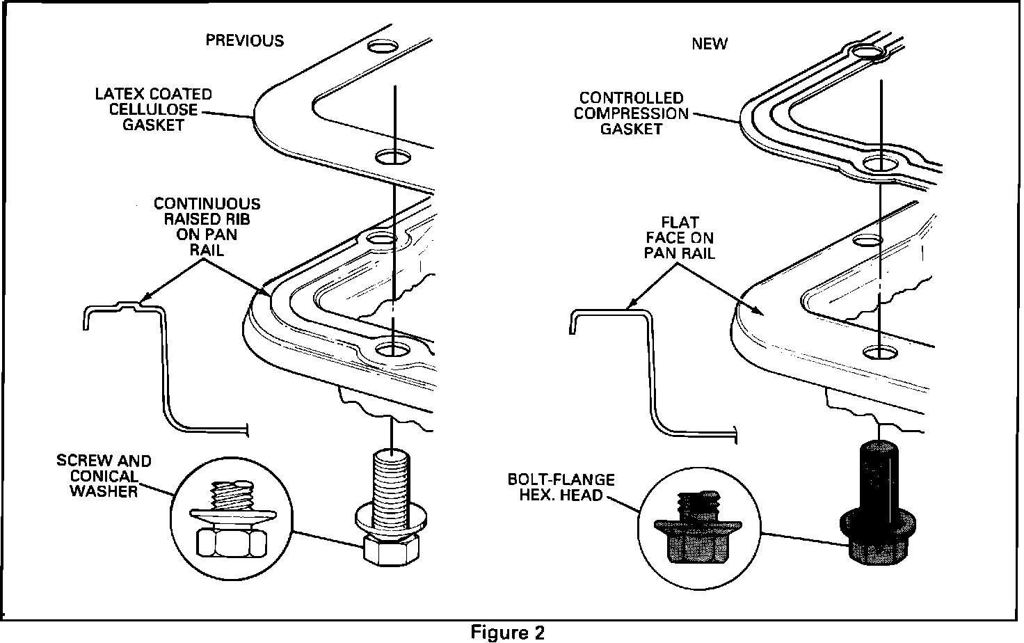 This new controlled compression bottom pan gasket can be used on all previous Hydra-Matic 4T60 transaxles when used with the new bottom pan and flanged hex head bolt. The old style conical washer screw can be used with the new bottom pan and controlled compression gasket, but the new flanged hex head bolt CANNOT be used on the old style bottom pan and gasket combination.
