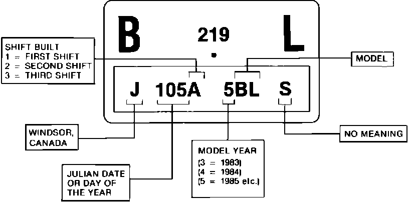 Important: All THM 125C transaxles built in Canada will have these new parts beginning start of production 1985. Some model THM 125C transaxles built in Canada are also built in the United States and can be distinguished from each other by their nameplates. The U.S. models have serial numbers (Fig. 3) and Canadian models have Julian Dates (Fig. 4).