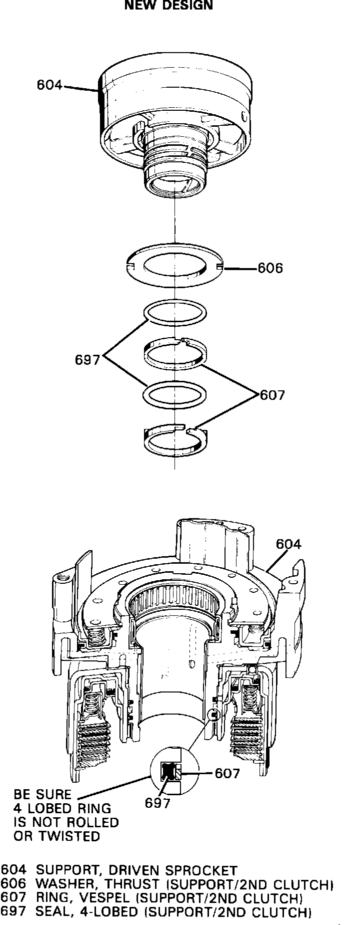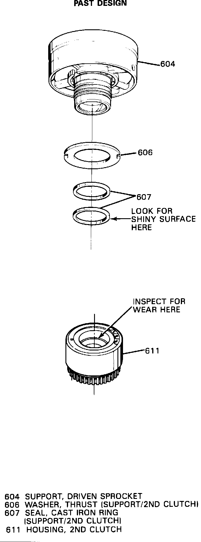 Inspect the cast iron oil seal rings (607) for wear (indicated by a shiny surface on the O.D.) and the 2nd clutch housing (611) for wear (grooves caused by the seal rings). The driven sprocket may not appear affected, but must be replaced if these wear conditions are present.