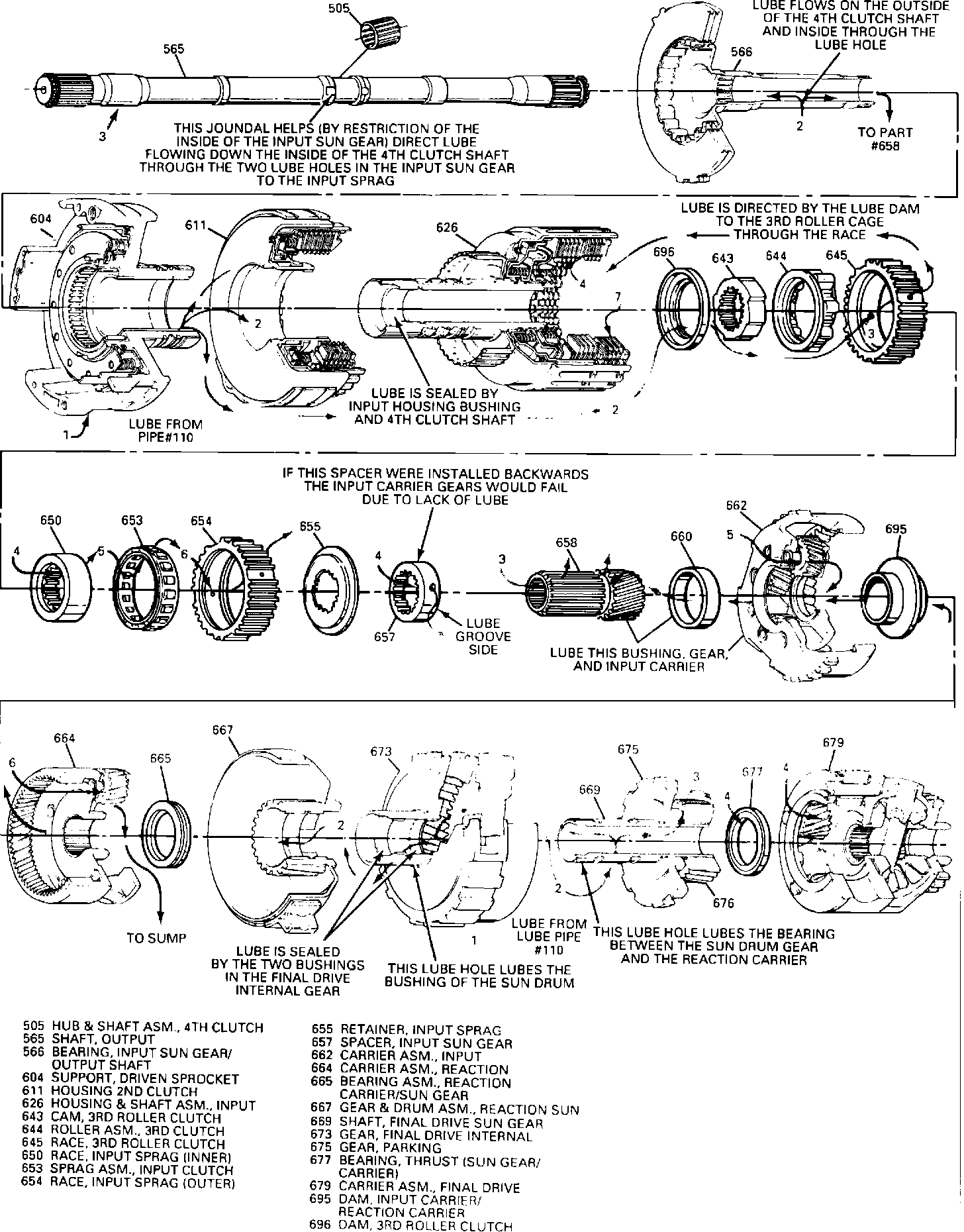 4. End Play: If the final drive has too much clearance, this will allow the final drive sun gear to move away from the thrust bearing in the final drive. This will allow too much lube fluid to leak out from the final drive sun gear shaft. With the correct final drive end play, the sun gear would block most of the lube fluid from escaping from the sun gear shaft. If the input housing has too much clearance, this would allow too much lubrication fluid to leak out between the input housing thrust bearing and 3rd roller clutch cam. Some leakage is designed in, but too much leakage, due to worn, damaged or missing bushings, too much end play or incorrectly installed parts could cause a durability concern. Refer to the lubrication circuit fluid flow description, Figure 1.