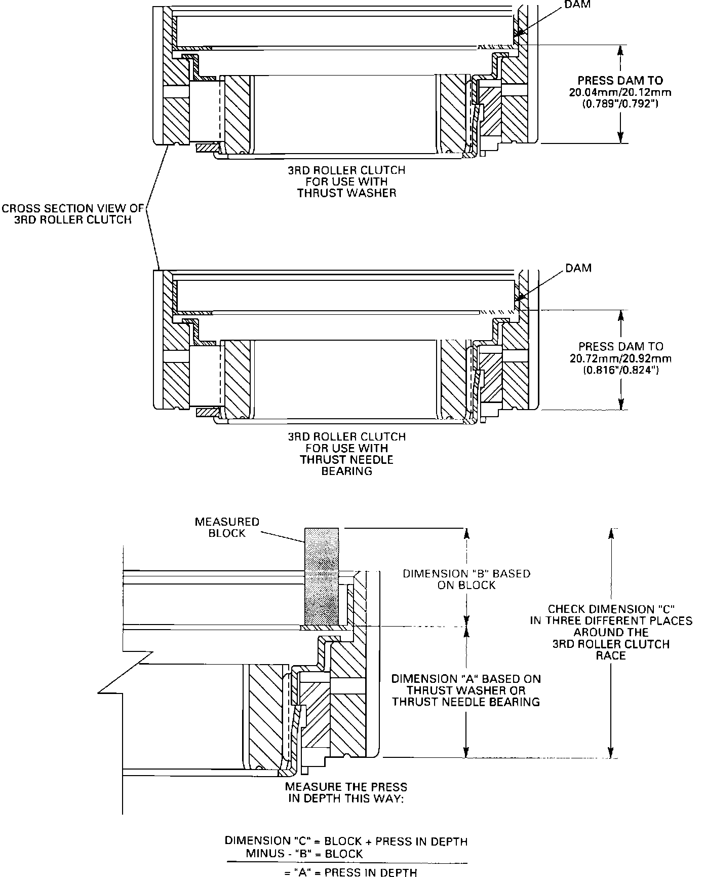 If using the thrust washer, press the dam (on models so equipped) to a depth of 20.04/20.12 mm (0.789/0.792") as measured from the bottom side (sprag side) of the outside race to the wide flat edge of the dam as shown in Figure 3.