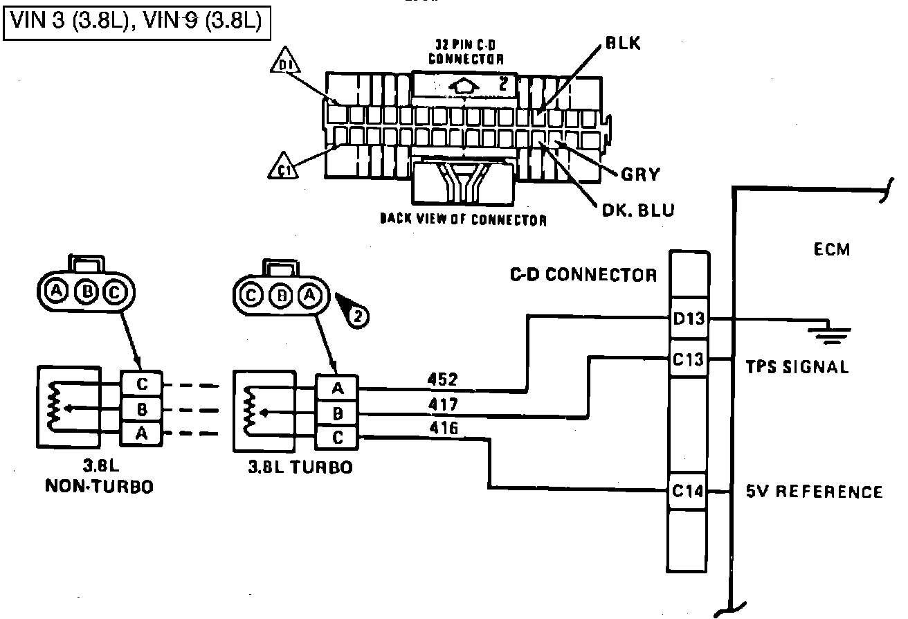 Fig. 007 - Wiring Diagram for Code 21 Throttle Position Sensor (Signal Voltage High). VIN 3, VIN 9: