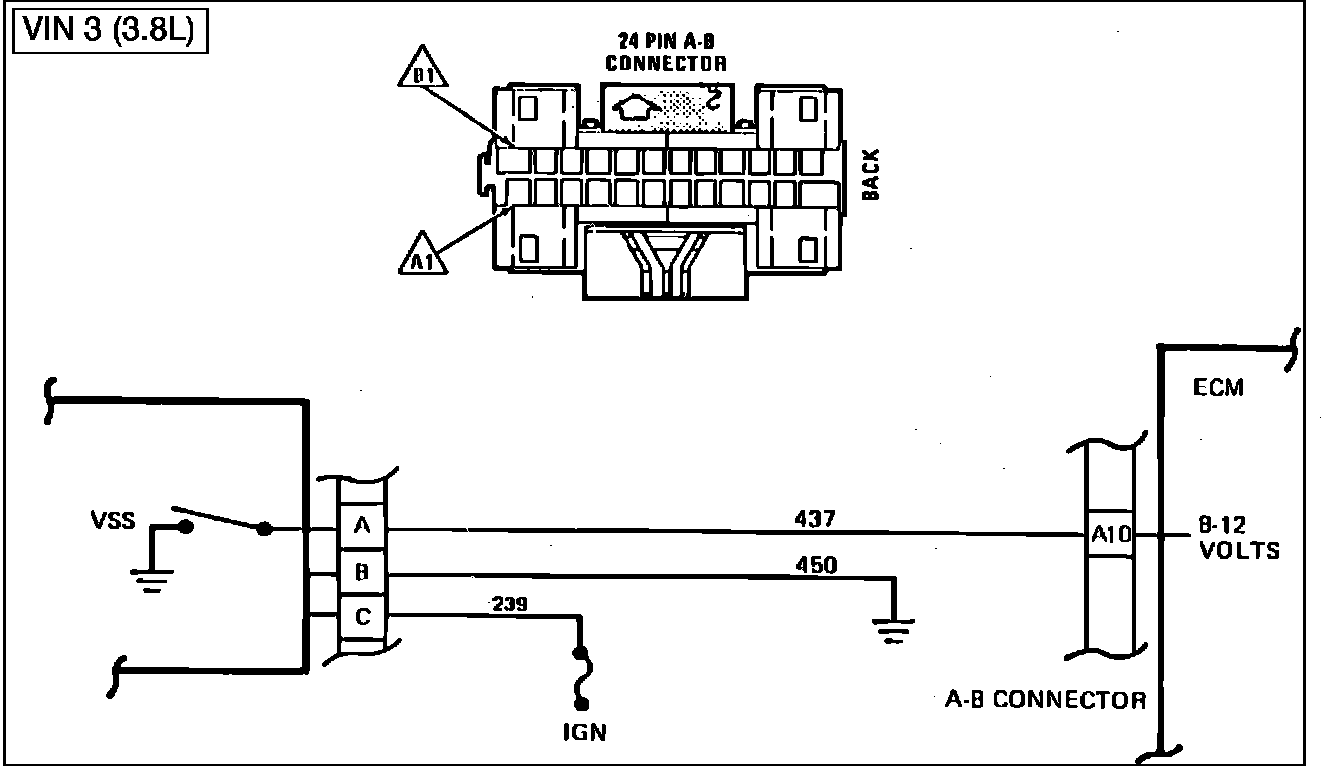 The VSS signal gives the ECM the car speed information. This is accomplished by the ECM supplying battery voltage to CKT 437. The VSS acts as a switch to ground the circuit as the wheels rotate. This switching action accurs approximately 2000 times per mile. The ECM counts the voltage drops in CKT 437 in a given time and converts thisinformation to car speed. This is part of the information used by the ECM to allow the converter clutch to engage and disengage.