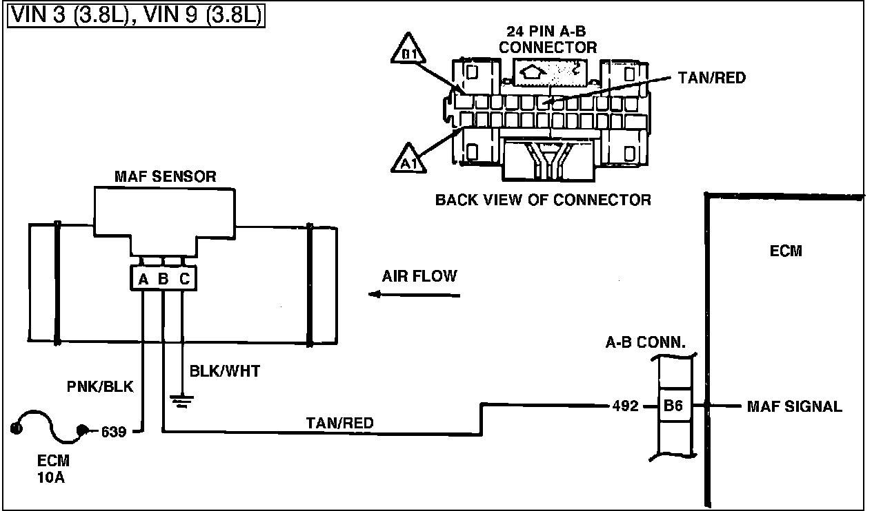 3. Checks to see if 5 volt reference signal from ECM is at MAF sensor harness connector. Less than 1 volt at this point indicates a faulty CKT 492, wiring connector, or ECM.