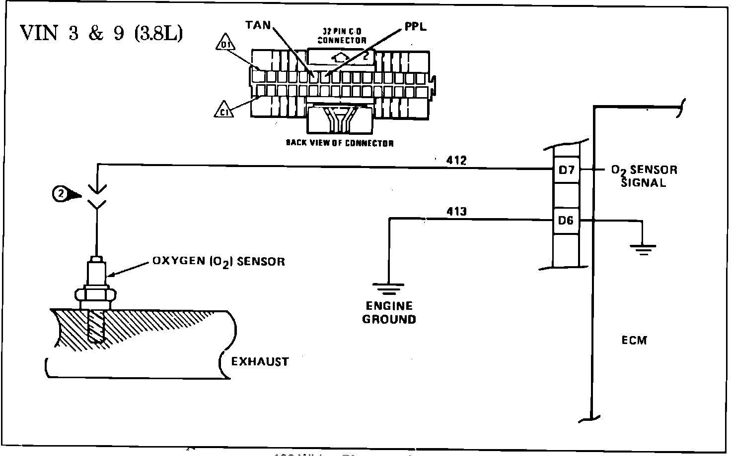 The ECM supplies a voltage of about .45 volt between terminals "D6" and "D7". (If measured with a 10 megohm digital voltmeter, this may read as low as .32 volts.) The O2 sensor varies the voltage within a range of about 1 volt if the exhaust is rich, down through about .10 volt if exhaust is lean.