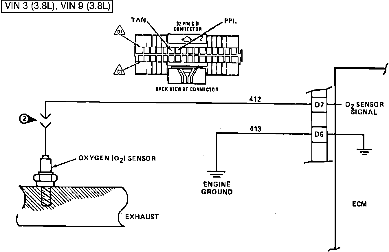 The ECM supplies a voltage of about .45 volt between terminals "D6" and "D7". (If measured with a 10 megohm digital voltmeter, this may read as low as .32 volts) The O2 sensor varies the voltage within a range of about 1 volt if the exhaust is rich, down through about .10 volt if exhaust is lean.