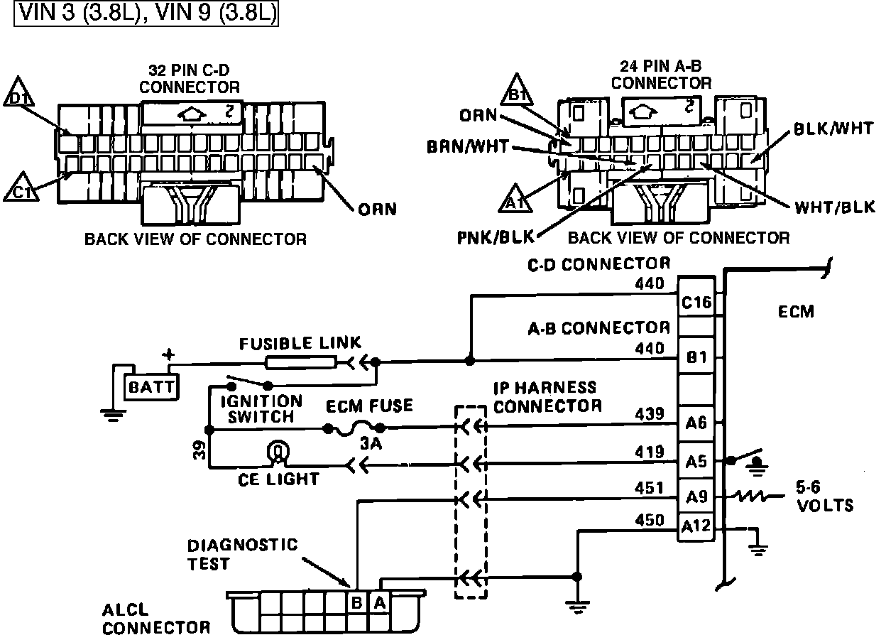 Fig. 011 - Wiring Diagram for Chart A-1 No "Service Engine Soon" Light. VIN 3, VIN 9: