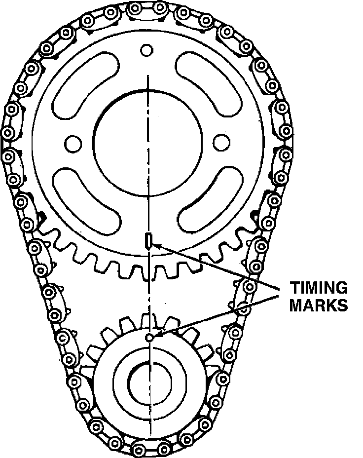 1. With front cover removed, as outlined in ``Engine Front Cover, Replace'', temporarily install balancer bolt and washer in end of crankshaft. Turn crankshaft so timing marks on sprockets are as close together as possible. Remove balancer bolt and washer using a sharp blow on wrench handle, so bolt can be removed without changing position of sprockets.