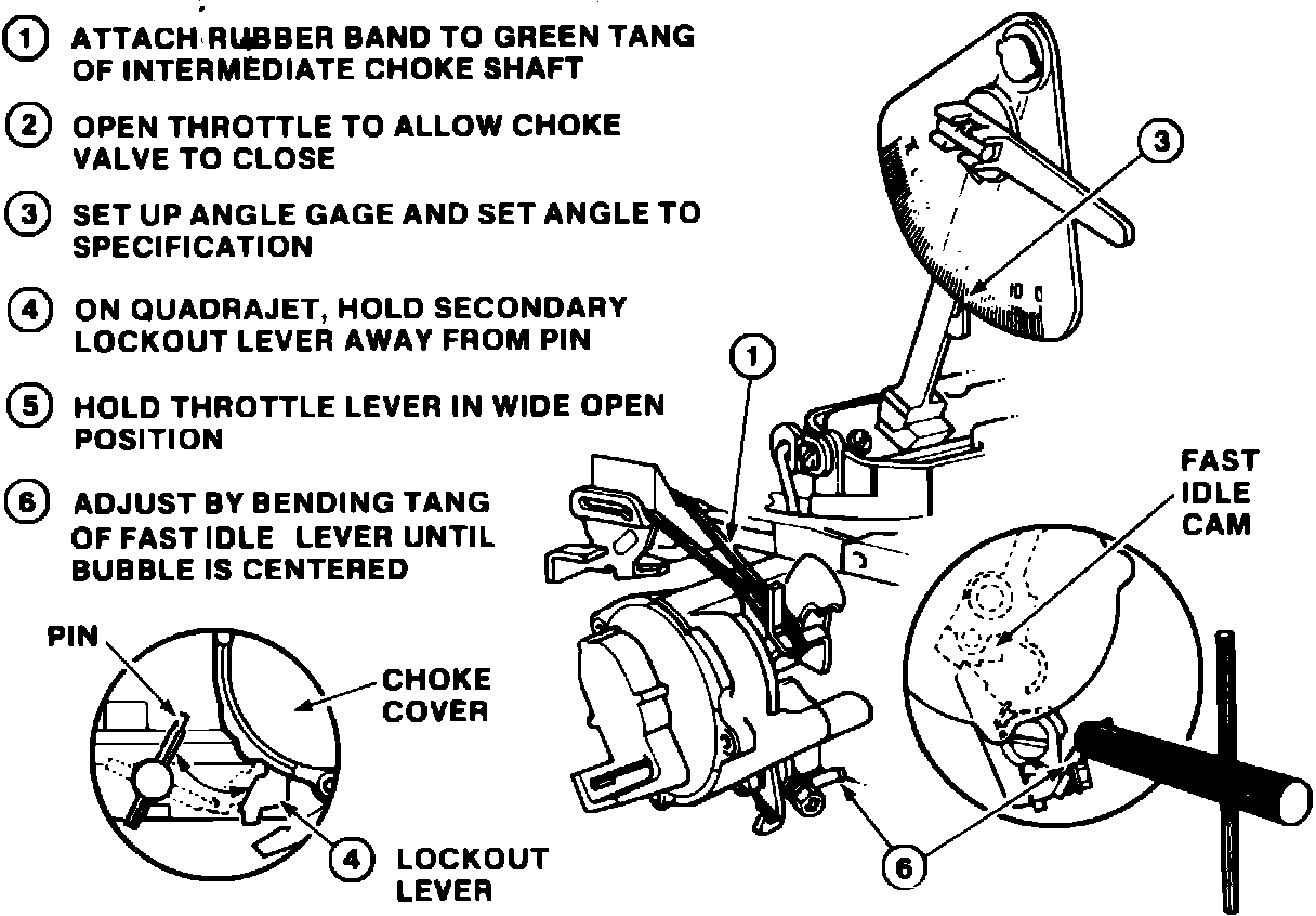 Fig. 12-Attach rubber band to green tang of intermediate choke shaft then open throttle to allow choke valve to close. Install angle gauge, then rotate scale until degree indicated on Specification Chart is opposite pointer. Hold secondary lockout lever away from pin, if applicable, then place throttle lever in wide open position. To adjust, bend fast idle lever tang until bubble is centered.