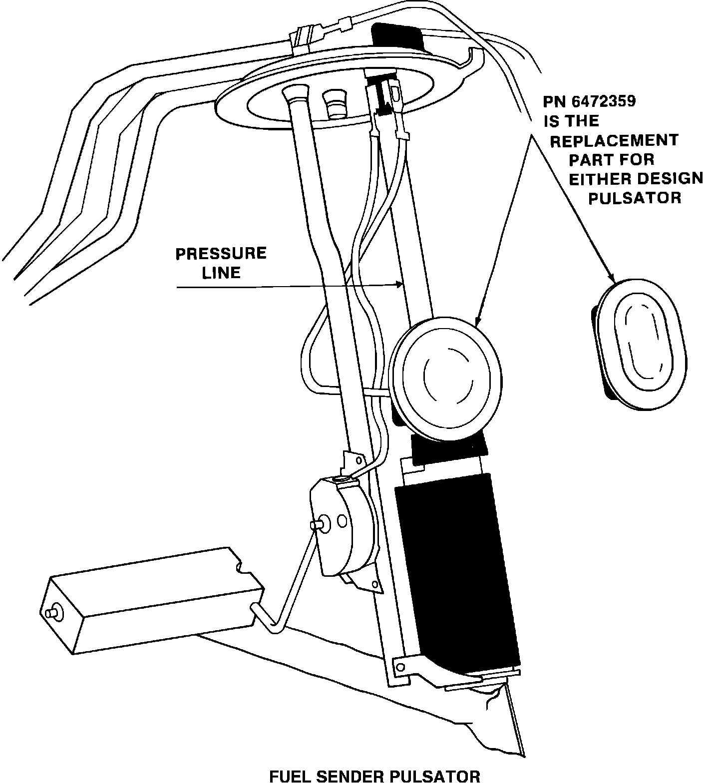 Chart A-7 in section 6E3 of the Buick Chassis Service Manual states that, while performing the Fuel System Diagnosis procedure, if the fuel rail pressure does not hold, but will maintain pressure while pinching the pressure line flex hose, the problem is either a leaking pump coupling hose or a faulty in-tank pump. However, the problem could also be a leaking fuel sender pulsator (see illustration).