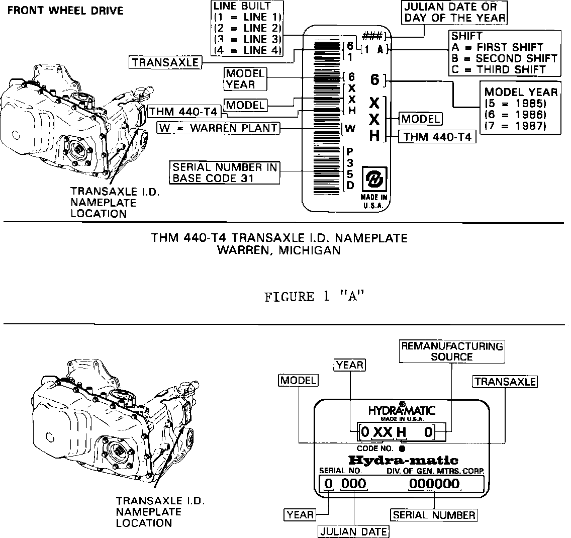 FIGURE 1 "A & B" - 440-T4 SRTA TRANSAXLE I.D. NAMEPLATE: