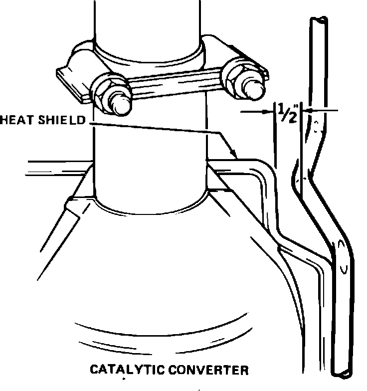 To correct this condition, loosen the A.I.R. pipe to converter clamp, reposition the A.I.R. pipe away from the heat shield and tighten the clamp. There should be about 1/2 inch clearance at the heat shield. Refer to Figure for location of clearance.