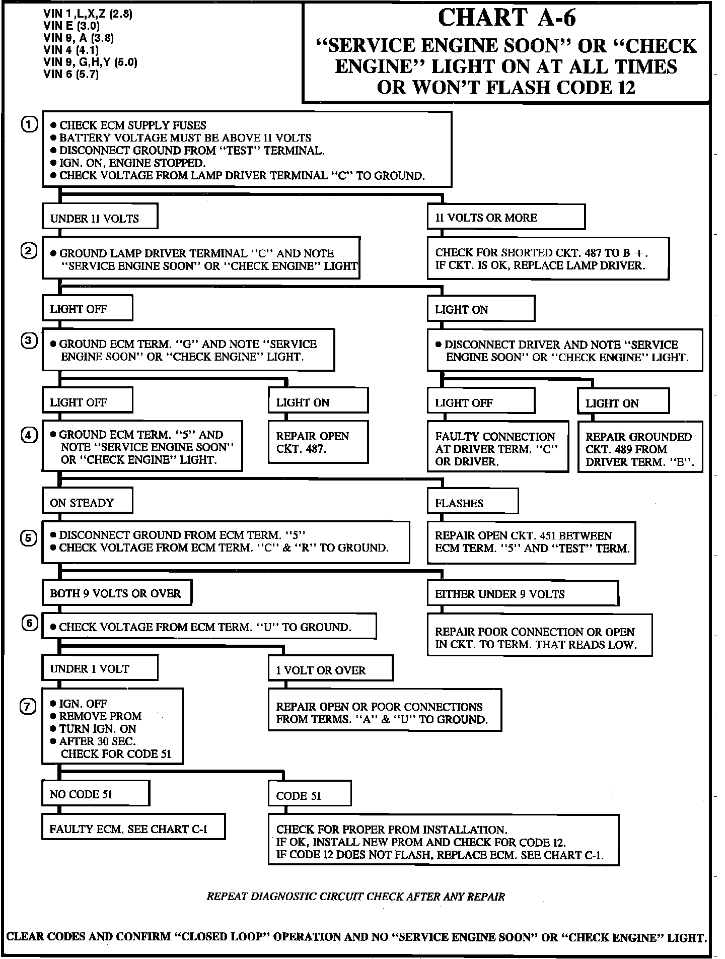 CHART A-6, WON'T FLASH CODE 12 OR "SERVICE ENGINE SOON" ON AT ALL TIMES