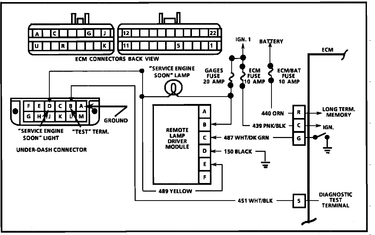 5. Checks for proper voltage supply to ECM. Both should read over 9 volts. Terminal 'C' is ignition and Terminal 'R' is constant battery for long term memory.