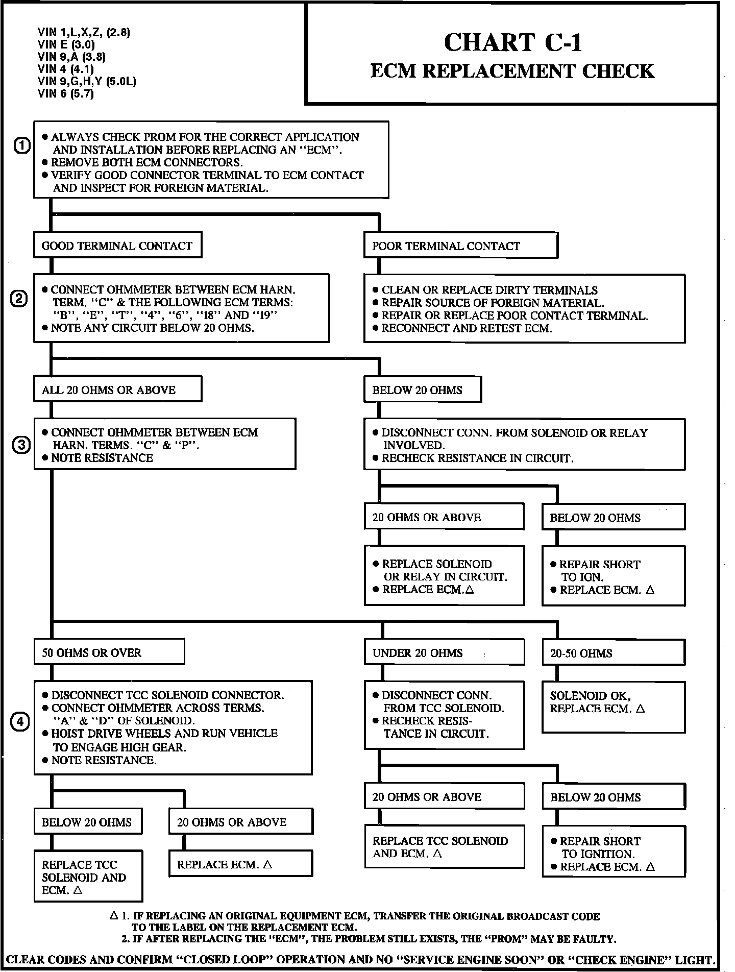 2. Checks for a short to ignition or shorted solenoid or relay. All terminals must be tested since several are connected internally in the ECM. A short in one circuit may cause another circuit in the ECM to be inoperative that does not have an external fault, but was the cause of "driver's complaint." Any circuit testing below 20 ohms is shorted to ignition, or shorted across the relay or solenoid.