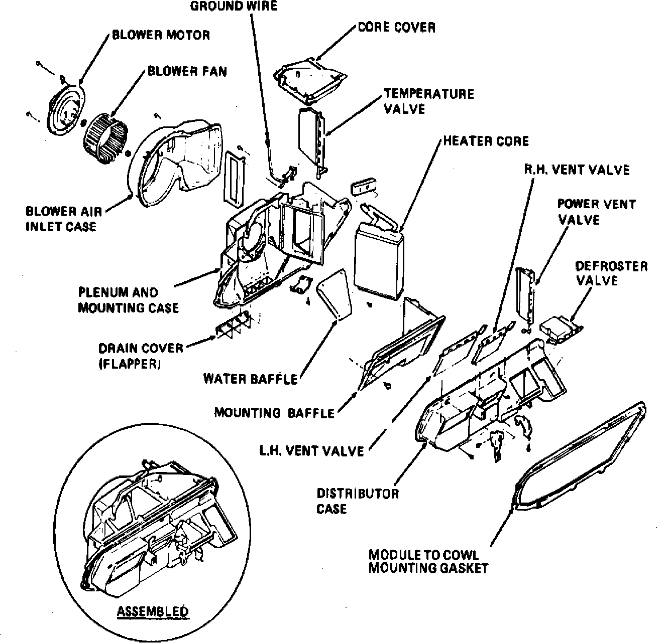 Fig. 13 Heater module assembly exploded view. 1982---87 Regal less A/C: