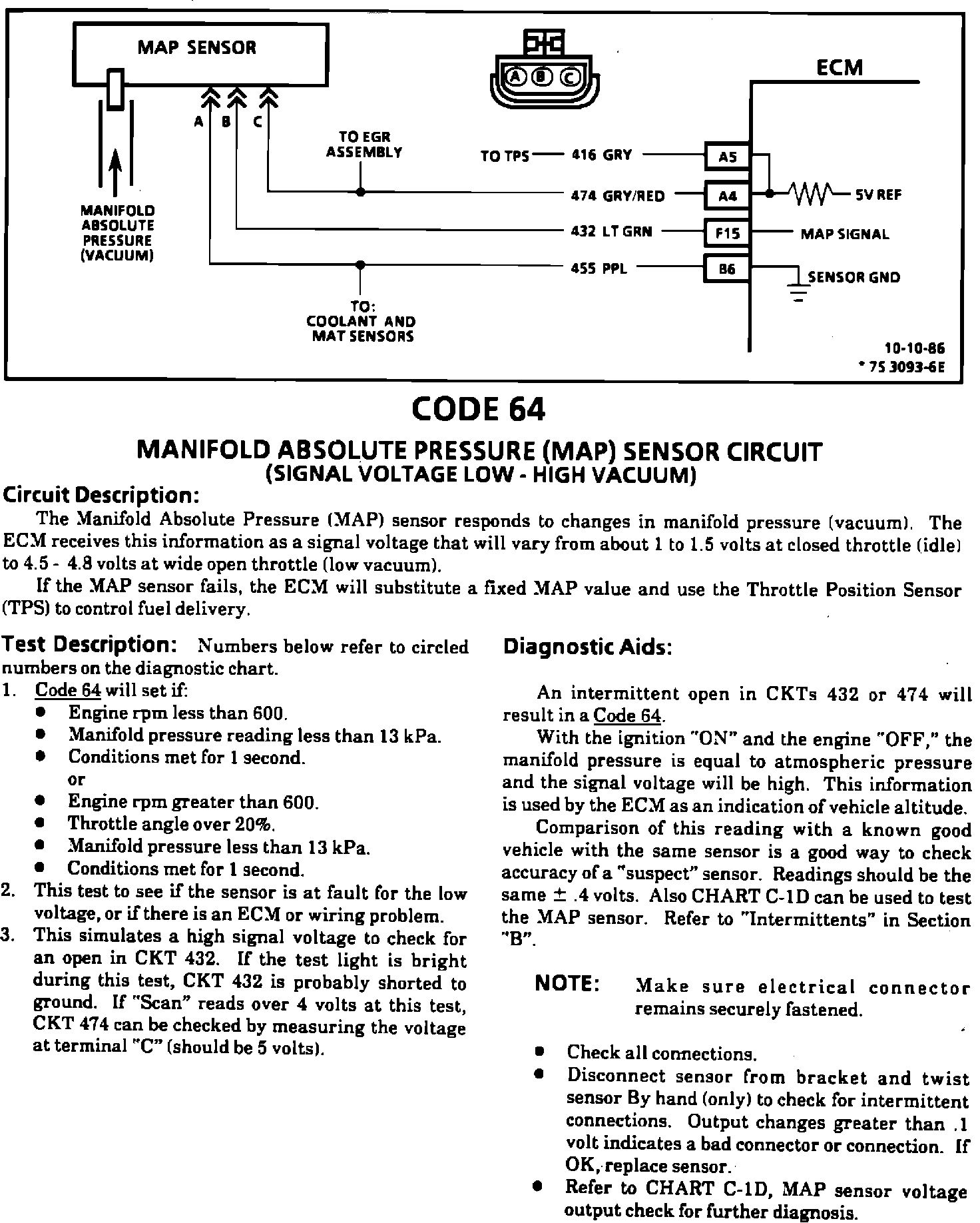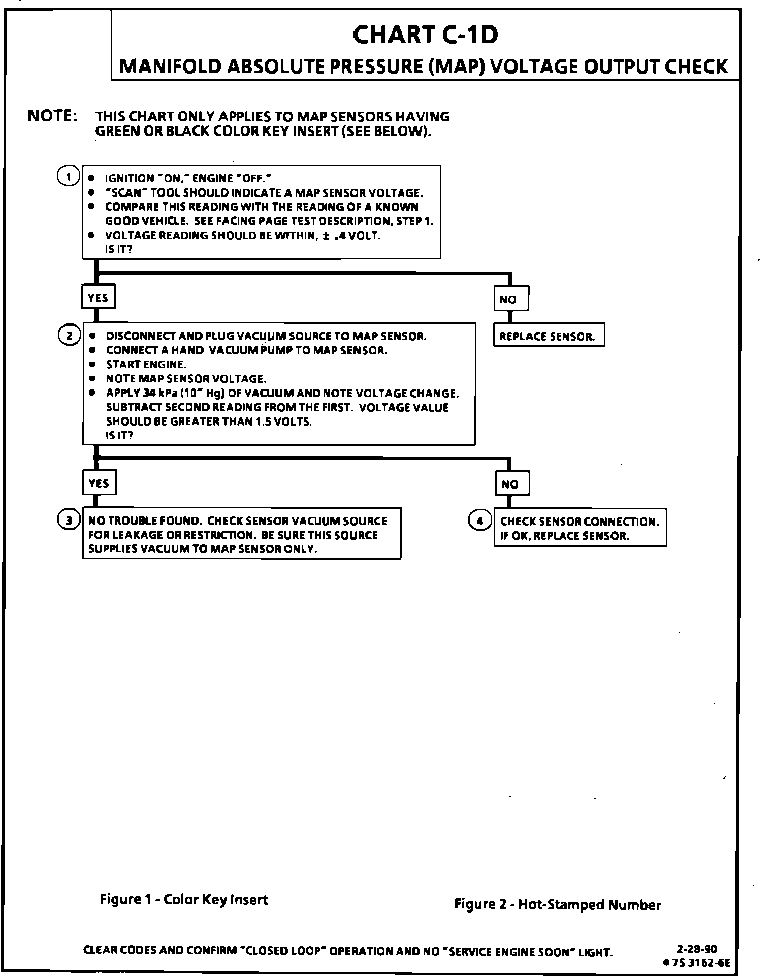 This bulletin revises the Manifold Absolute Pressure (MAP) Output Check Chart C-1D and updates Code 33, Code 34, Code 63, and Code 64 of the respective Service Manual section on "Driveability And Emissions" (Section 6E1, 6E2, and 6E3). This information applies to all MAP Sensors on 1980-1990 vehicles with gasoline engines (except turbocharged) with green (standard) MAP sensor electrical connector insert or the solid black MAP sensor electrical connector insert.
