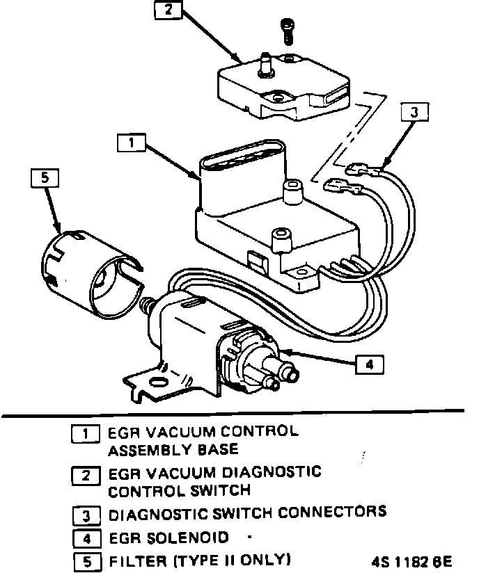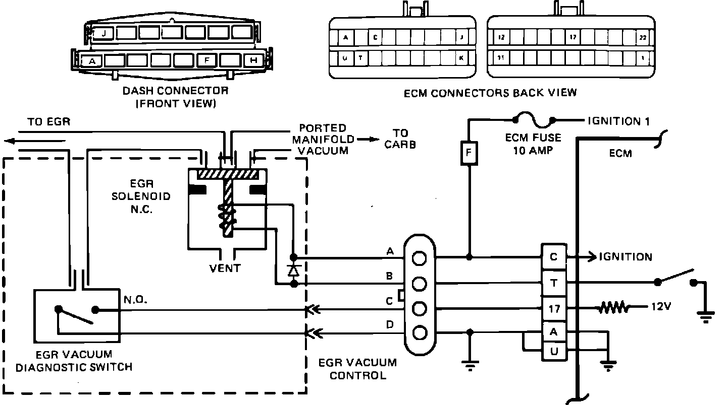 The EGR Vacuum Control is an ECM controlled solenoid that pulses ported manifold vacuum to the EGR valve. The ECM controls the EGR vacuum by completing the ground to energize a normally closed solenoid. The EGR is "pulse width modulated"; that is the ECM varies the amount of EGR, by the amount of time the solenoid is "ON" or "OFF". Part of the control includes a Vacuum Diagnostic Control Switch. Its purpose is to signal the ECM when vacuum is actually being applied to the EGR valve. The EGR vacuum diagnostic control switch is serviced separately.