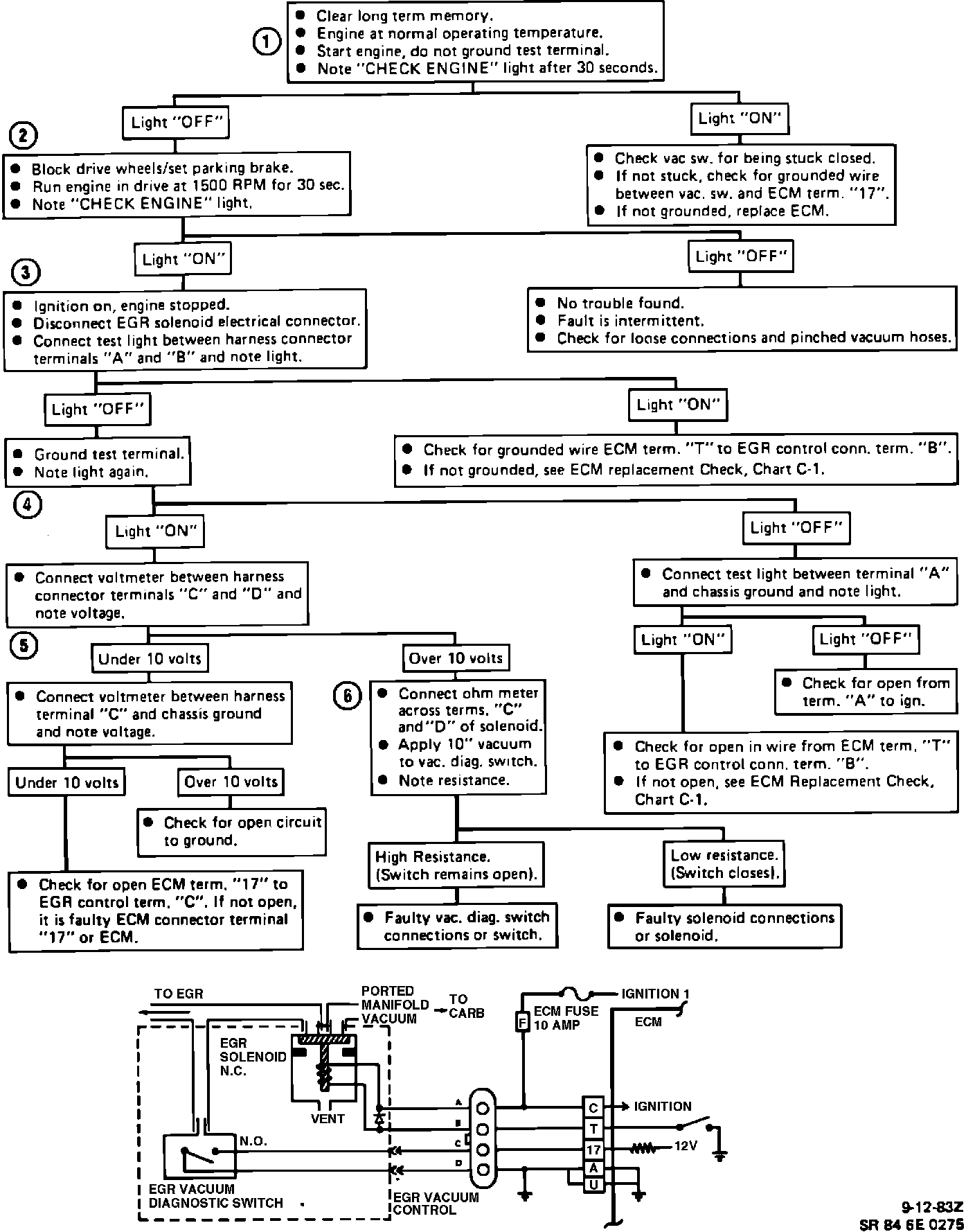 6. Determines whether diagnostic switch or EGR solenoid is at fault. By applying 10" vacuum to diagnostic switch with an ohmmeter across terminals of the switch, a functional check can be made. If the switch functions and resistance drops to near zero, fault is a poor connection or faulty solenoid.