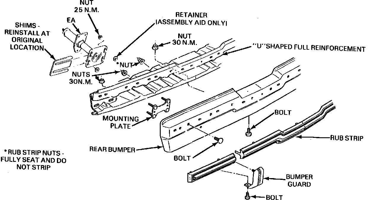 7. Install bumper assembly onto EA's, placing any removed shims in their original location. Center bumper on vehicle and tighten attaching nuts to 25 N-m (19 ft.lbs.).