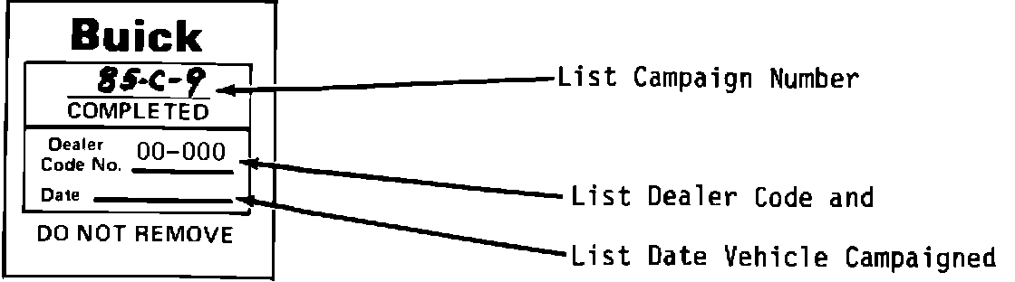 Each vehicle modified in accordance with the instructions outlined in this Product Campaign Bulletin will require a "Campaign Identification Label." Each label provides a space to include the five-digit dealer code of the dealer performing the campaign service. This information may be inserted with a typewriter or ballpoint pen.