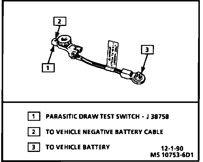 Vehicles produced between 1980 and 1991 may experience a no start condition due to a dead battery. Follow the service manual procedures to test the battery and charging system. If the battery and charging system are functioning normally, an unusual current draw may have discharged the battery, resulting in the no start. The following procedure has been developed using the parasitic draw test switch, tool J 38758.