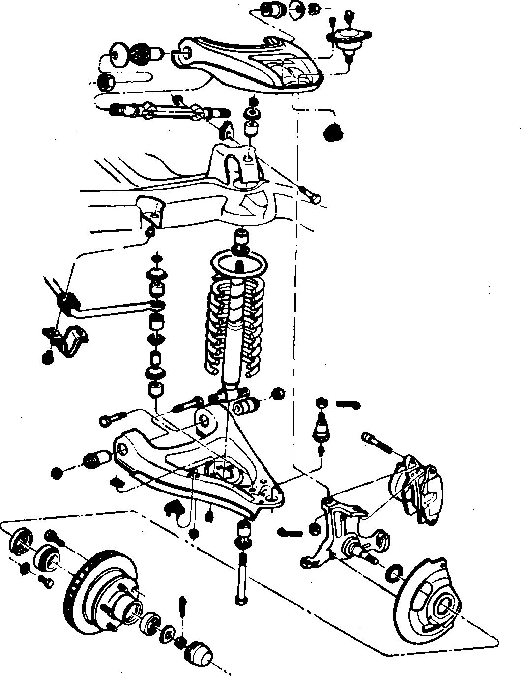 On this type front suspension, Fig. 1, each wheel is connected independently to the vehicle frame by upper and lower control arms, ball joints and a steering knuckle. The upper and lower control arms are designed and positioned to allow the steering knuckles to move in a prescribed three dimensional arc. Tie rods, connected to the steering knuckles, ensure the front wheels are held in the proper relationship to each other.