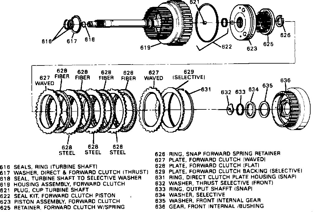 Forward Clutch Assembly, minus Check Ball in housing (619) Forward Clutch Piston Assembly (623) Additional waved plate (627) Front Internal Gear (636)